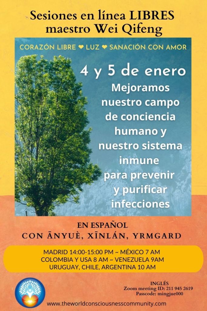 Les invitamos a las sesiones libres que dará el maestro Wei Qifeng a las 9 pm hora de Beijing.Sesiones enfocadas en fortalecer el campo de conciencia humano y el sistema inmune a través del amor universal, en este momento tan especial. Invita a tu familia, amistades y toda persona que sepas necesita apoyo para lograr un equilibrio, confianza, serenarse, mantenerse alegre y fortalecer su/nuestra salud.