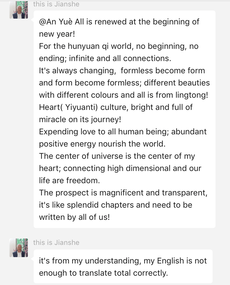 El maestro Liu Jianshe compartió hace unos días este mensaje de Año Nuevo del maestro Pang Ming. Estaba escrito en chino y enseguida lo pasamos por el traductor de las redes, con lo cual tuvimos una ligera aproximación a su contenido. Hoy el maestro Jianshe Liu nos ha enviado su cuidadosa traducción, aclarando que su inglés le queda corto para traducir una información tan preciosa. Sin embargo creemos que el maestro Jianshe es una de las personas idóneas para esta labor, por su amor a ZhìNéng QìGōng, y a la fuente de conocimiento y libertad que es el maestro Pang Ming.