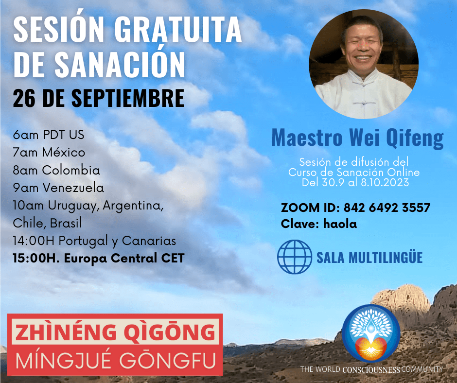 El martes 26 a las 15:00 de España -CET- el profesor Wei Qifeng te invita a una sesión de sanación. En ella experimentarás el campo de sanación que generamos los organizadores, con la guía del maestro Wei, de modo presencial. Un anticipo de lo que vamos a vivir durante el Curso de Sanación en línea, transmitido en directo, desde el Primer Retiro Presencial de Zhineng Qigong Mingjue Gongfu. No te lo pierdas. Únete a la nueva humanidad que estamos gestando muchos corazones abiertos.