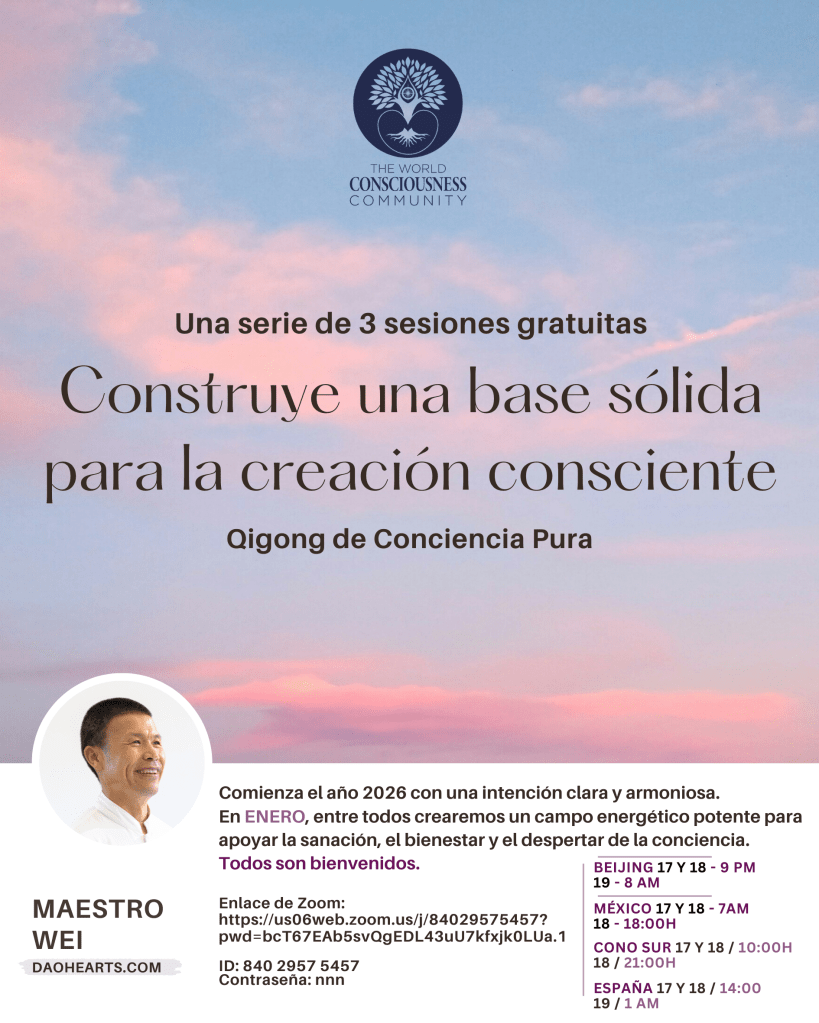 Comienza el año 2026 con una intención clara y armoniosa. El Maestro Wei y La Comunidad de Conciencia Mundial, colectivamente, estableceremos un campo energético fuerte para apoyar la sanación, el bienestar y el despertar de la conciencia. Tanto si eres nuevo en el qigong de conciencia pura como si estás entrando en la siguiente etapa de tu viaje, estas sesiones pueden ayudarte a prepararte para una transformación más profunda en el nuevo curso anual.