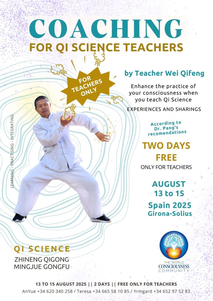 La Ciencia del Qi se centra en el despertar de la Conciencia pura Mingjue y se basa en los métodos de Zhineng Qigong. En nuestra práctica conectamos de corazón a corazón para crear un Campo de Conciencia Despierta Mingjue a nivel mundial. Este Campo autoconsciente Mingjue favorece la transformación de la conciencia humana, llevándola a un estado de armonía, paz, amor, alegría y libertad. En suma, salud con mayúsculas. Quienes organizamos los encuentros sabemos que este campo de conciencia es real y nos dedicamos a propiciar que sus efectos benéficos lleguen a más personas cada día. El Dr. Pang Ming creador de la Ciencia del Qi dijo recientemente: