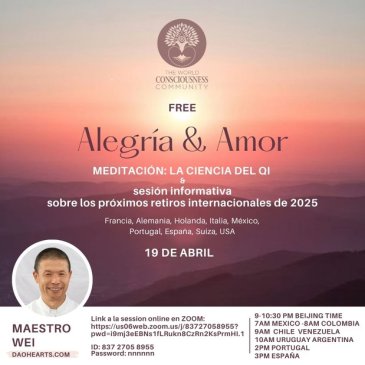 SESIÓN GRATUITA CON EL MAESTRO WEI QIFENG – 19 DE ABRIL El Profesor Wei Qifeng nos invita a esta sesión gratuita en la que hablará de la Ciencia del Qi. También dedicará una parte de la sesión a informar sobre los retiros de 2025 y a explicar las ventajas de asistir a retiros presenciales. Creemos … More Alegría & Amor